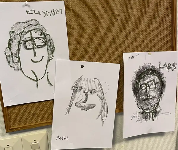Vi ritar av varandras ansikten med krita, utan att titta på papperet. Det är jag i mitten på bilden.