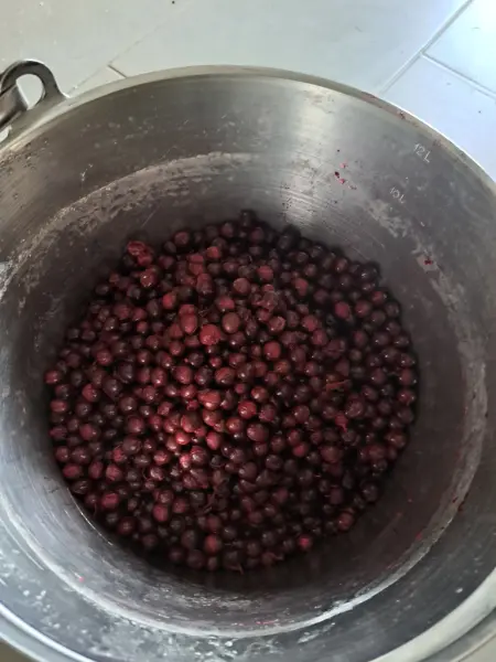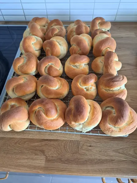 När jag kom hem, bakade jag 24 gotlandsbullar. Jag silade också upp slånbärssaft och kokade den. Bären hade jag plockat tidigare och frusit in. De måste var frostnupna, annars blir saften besk. på det här sättet blir den god.
