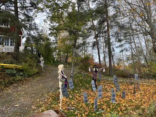 Vi pratar om allt möjligt: om grannar som bor i området, hus som renoveras, växter, att en granne förberett sin trädgård inför Haloween (se foto). Själv håller jag mer på våra svenska traditioner inför AllaHelgonsDag – att tända ljus på kyrkogården och tänka på sina nära och kära.