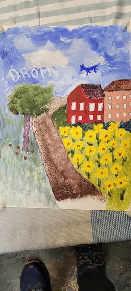 När vi kommer hem tar vi en eftermiddagsfika. Efter fikat tar jag fram mina målar penslar och fortsätter på en tavla..