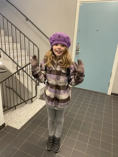 Barnet klär på sig och följs till skolan av man och hund. Barnet är lite extra pirrig idag, då hela skolan ska sjunga för alla vårndadshavare, för FN-dagen.