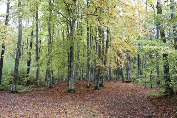 Jag hade med mej min nyinköpta kamera men ljuset var svagt och färgerna lite matta en sådan här mulen dag men när vi gått nästan hela slingan kom solen fram några härliga minuter. Ett kort på bokskogen och det härliga ljuset blev det i alla fall.