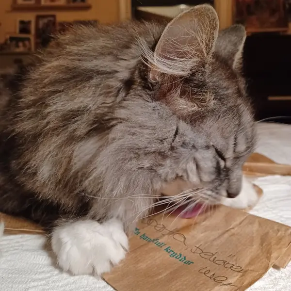 Jag gick upp tio i åtta (som vanligt), befriade min man från urinpåsar, gick nerför trappan till köket. Där väntade katten Måns på påfyllning i skålen och jag fyllde på kaffekopparna för min man o mig. Lyssnade på radio, stickade på en kofta till en svärson.