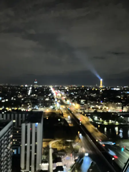 Jag, kollegan och hennes man besöker hotellets takbar och avnjuter en dryck a 10€ vardera. Sen lite mer koll på utsikten från rummet. Eiffeltornet har olika ljusprogram, den roterande strålen, sprakande som fyrverkeri, men runt 2345 släcker dom ner för att spara energi och för att uppmuntra allmänheten att spara energi.