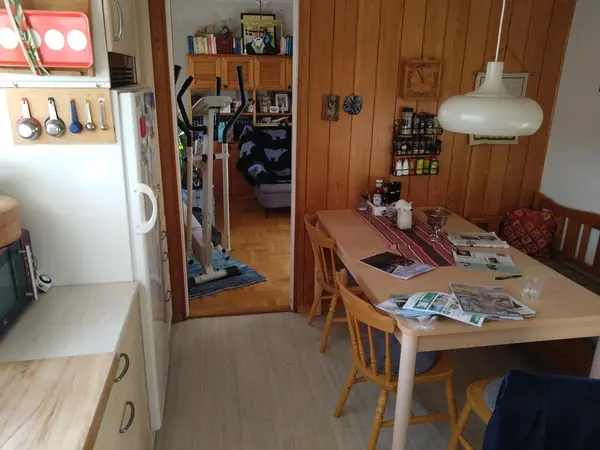 Då gröten var färdigkörd i micron drog jag som vanligt skeden runt kanterna för att samla den i mitten och lade på sylt samt fyllde på mjölk. Jag åt i tystnad men såg att klockan var fem i sju så jag gick några steg in i matrummet / träningsrummet bredvid vårt vardagsrum. Skjutdörrarna mellan rummmen var helt öppna. Där slog jag på radion, morgonekot. Radion står på farfars rallarlåda från 1890 talet , ett av de få minnessakerna jag hade från den generationen då de dött innan jag kom till och jag fick min barndoms somrar i Gäddede ,med mammas släkt i stället, större delen av Frostviken var släkt faktiskt. Faktiskt ända nere i Tåsjö kunde man hitta släkt. Min fru och jag är fem och åtta männingar på hennes morfars och farfars sida något vi upptäckte i min systers släktforskning tjugo år efter giftermålet.