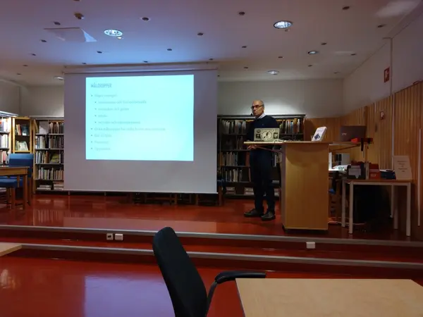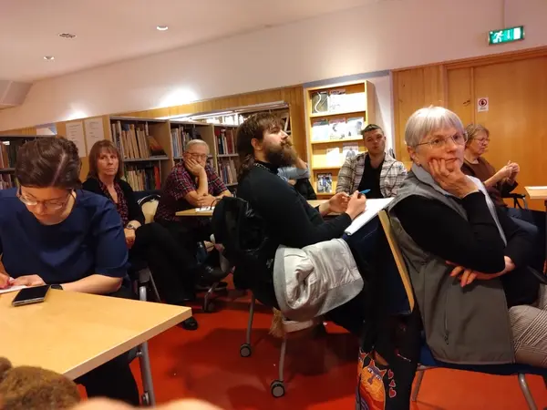 Det var ordentligt med folk på föreläsningen , PRO are, bröst canser föreningen , en teatergrupp Vänsterpartiet med ombudsperson och SAP ombudsperson, bland andra. Föreläsningen genomfördes av en person som har lång erfarenhet som förtroendevald och anställd i ideella föreningar. En man som bland annat varit ordförande för Ax – kulturorganisationer i samverkan och Sveriges film- och videoförbund och kanslichef för Sverok (ett av Sveriges största ungdomsförbund). Idag arbetar han som konsult med uppdrag inom organisations- och verksamhetsutveckling i ideella föreningar. Så presenterades han. Han gick noggrant igenom begrepp som Information, mål, syfte och målgrupper före fikat klockan 15:00. Efter det spårade det helt ur då han började gå in på lagar och regler och hur en förening skall skriva planer som jämställdhetsplaner och ett femtontal andra planer, bland annat krisplaner om något skulle hända under en aktivitet. Hur många planer som helst som ingen vanlig förening skulle orka med att ens tänka på. Sedan gick han in på hur man inte skulle programmera om exempelvis Discord då det kunde gå snett. Då hade föreläsningen pedagogiskt kommit upp ungefär 100 % över en Informatik professor som föreläste på en humanistisk fakultet. Väldigt besviken diskuterade jag lite med ett par 80 åriga damer denna upplevelse på väg upp till bilen. Hemma ringde jag min vän och fick reda på att allt gått bra med flytten. Satte mig sedan med dessa enkla rader i en dagbok till Nordiska Museet. Efter ett litet tag sade magen ifrån och jag blev tvungen att äta middag. Tillagade sex bitar blodpudding och tog fram jordgubbssylt till den. En smak jag inte delar med andra men alla lider ju inte heller av diabetes och sockerberoende. Jag fick äta ensam eftersom min fru är på Kyrko råd och kyrkokör som sagts tidigare. Jag drog fram TVn vi har i matrummet till köksdörren och såg 18:00 rapport medan jag åt. Kaffe och kaka blev det till kulturnytt. Då det inte är någon ide´att se på det förlängda rapport 19:30 så såg jag i stället en hjärndöd berömnd Science Fictionserie som heter Galactica. Jag lägger I pad plattan i sitt fodral över instrumentbrädan på crosstrainern och passar på att få motion samtidigt som jag ser filmen. Varje kväll kan ju inte behövas ägnas åt folkbildning tänkte jag. Då min fru kom hem 21:30 ville hon varva ner lite innan det var dags att lägga sig. Hon tog en bit sockerkaka och gav mig en Singoalla. Jag försökte skämta med hennes sångkör som hon kom från sjung med alla alltså men det gick inte hem, Vi gick till sängs 10:30