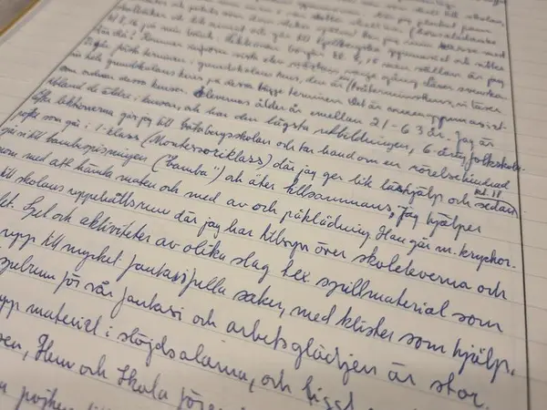 Bäddar min och min mans sängar, väcker vår son som skall till skolan, han går i 3:e ring på Burgårdens gymnasium. När jag plockat fram lunchmaten, som min man o vår dotter skall ha, (hönsalådaube, rödbetor och potatis som dom steker själva) tar jag min kasse med skolböcker och lite annat och går till Kjellbergska gymnasiet och sitter kl. 8.16 på min bänk. Lektionen börjar kl. 8.15 men sällan är jag där då! Kommer in som sista elev nästan varje gång. Läser svenska. Vi går första terminen i grundskolans kurs, den är en tvåterminskurs, vi läser in hela grundskolans kurs på dessa bägge terminer. Det är vuxengymnasiet som ordnar dessa kurser. Elevernas ålder är mellan 21 – 63 år. Jag är ibland de äldre i kursen, och har den lägsta utbildningen, 6-årig folkskola.