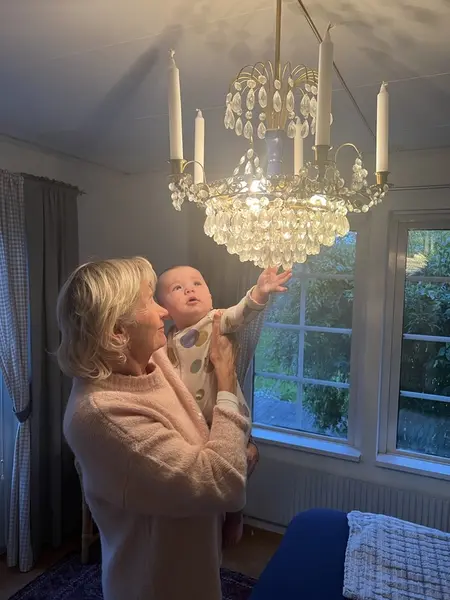 Min son Pontus med barnbarnet Lion, snart 6 månader, kommer nämligen ner för att säga adjö innan jag ger mig av – och innan de och Madde senare ska resa tillbaka till Oslo. Lion får en flaska mjölkersättning som just blivit färdig i den på Sverige-resan medhavda vällingberedaren, en maskin som doserar och värmer babydryck till önskad temperatur på nolltid. När han druckit upp får jag chans att umgås lite med honom. Jag bär honom till den lilla kristallkronan i sovrummet och vi får den att klirra vackert genom att dra våra händer genom prismorna. Eller, rättare sagt, Lion är nöjd med att ha fått ett hårt grepp om en prisma. Sen ligger han på rygg en stund på min säng, i happy baby-position, medan han testar sina röstresurser i olika ljud och läten. Gosandet måste dock avslutas när jag inser att jag behöver borsta tänderna innan det är dags att bege sig till bussen. På med varm jacka och ett par bekväma jympaskor och mot hållplats Höjdvägen.