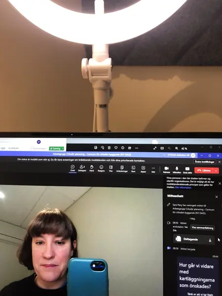 Mötet, som skedde på länk över Microsoft teams, startade 9:00 och det var 23 deltagare från hela landet. När övriga deltagare var inne i digitala grupprum passade jag på att ta en bild på mig själv som jag skickade till några kompisar som varit med när jag köpte läppstiftet. Onödig kommunikation men vi brukar skriva både trivialiteter och livsviktiga saker till varandra under dagen.
