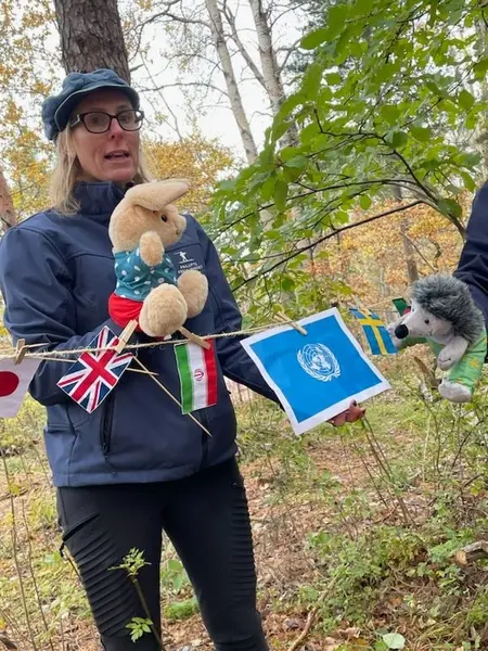 Jag och en kollega tar var sin handdocka, Kanin och Igelkott. Vi har en jordglob och har hängt upp flaggor från länder som barnen har anknytning till. Med hjälp av figurerna pratar vi om jorden, att det finns många länder och många människor som pratar olika språk. Vi tittar på flaggorna, barnen hjälper oss med vilka flaggorna är. FN-flaggan hänger uppe och “Kanin” berättar om vad FN är och jobbar för på ett enkelt sätt och att barn har egna rättigheter i och med Barnkonventionen. Handdockorna hjälper oss i lärandesituationen då det är inte vi pedagoger som berättar utan figurerna vilket gör det mer intressant och roligt för som barnen är mellan 1 och 4 år. En blandad åldersgrupp innebär att de äldre barnen hänger med på ett annat sätt än de yngre och kan inspirera de yngre barnen. Vi sjunger sången “Hej, goddag och hallå!” och säger hej på olika språk: spanska, japanska, jola, arabiska, engelska… -Mat!, ropar ett barn. Ja det är dags för mat-ramsan och att ta fram mellis-mackorna ur lådan och servera te med mjölk som vi dricker ur kåsor.