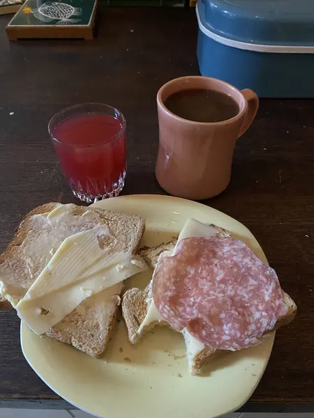 8.45 Låg kvar lite väl länge i sängen. Fastnade med mobilen, såg reels och kollade de olika kontona på Instagram jag styr – mitt eget och det för Sthlm Honky Tonk, en countryklubb jag och fyra andra arrangerar ideellt. När jag gick upp gjorde jag min lilla träning – några squats, sit-ups och stretch för ryggen, höfterna och armarna. Jag jobbar som frilansande textilkonstnär med fokus på väv och försöker göra vad jag orkar för att håll knän och bål, rygg i form för det. Jag klädde på mig – mammas ljusrosa jumper från 60-talet som hon fick av sin bror när han var i Kanada. Hängselbyxor – mina numera standard-arbetarbyxor, köpta på Second Sunrise, denimbutiken på Katarina Bangata som mina kompisar driver. Jag har sovit med en frisyr som jag nu fixar till genom att rulla upp längderna i pin curls och sätter en scarf över. Ikväll ska jag på Studiecirkel på Medborgarhuset i Hägerstensåsen, ”Countrycirkeln”. Det är andra gången av fem, första gången var väldigt trevlig och intressant. Ikväll ska vi diskutera country ur ett politiskt perspektiv, det ser jag fram emot! Kul att ha en lite fin frisyr tills dess, och håret är ändå i vägen när jag väver om jag har det utsläppt. Imorgonkväll ska vi ha den första av veckan två klubbar med Sthlm Honky Tonk, releasefest för Jonas Crambys nya bok ”Americana – maten, musiken, spriten, romantiken” där vi är med och håller two step-kurs, countryquiz och så har vi fixat bandet ”As Good as Brothers”. Det ska bli kul! På fredag är andra klubben, då ”Bluegrass friday” på Twang (vårt ”hemmaställe”) med bandet Plains and Pines. Alltså – en ganska ovanligt händelserik vecka och därav värt att hålla frisyren igång. Förr, som vintagenördig tonåring och 20+are gjorde jag det jämt oavsett vad jag skulle göra, nu som 33-åring med lite mer stadig vardag (då jag mest är i ateljén och hemma på vardagarna) blir det mer vid speciella tillfällen. Det är skönt på ett sätt att inte känna behovet av att lägga så mycket tid på det, men visst känner jag mig alltid snyggare när jag väl gjort en lagd frisyr. Nu- frukost! Det vanliga: kaffe i någon av mina tre favoritmuggar (klassiska amerikanska diner-muggar, köpta på ett antique mall nånstans mellan Los Angeles och Austin på en episk road trip 2018), rostmacka med smör och ost, lite juice.