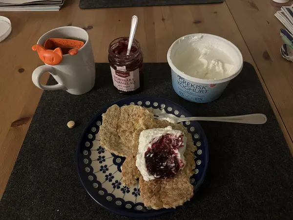 Jag vaknade runt kl.6. Till frukost åt jag ”pannkakor” gjort på fiberhavre, banan och ägg, med grekisk yoghurt och körsbärs sylt.