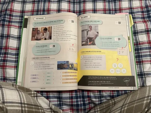 När jag har ätit klart gick jag till sängen men min Koreanska lärobok för att öva lite innan min nästa lektion, som jag har online imorgon efter jobbet.