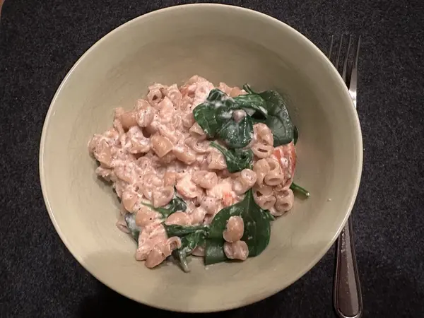 Hemma hade jag halv portion av stekt lax från igår. Jag har ätit det med stuvade makaroner och baby spenat. Medan jag väntade på makaroner duschade jag.