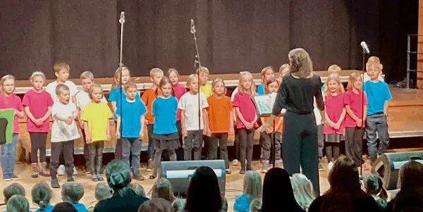 Det är FN-dagen idag och för att fira den ordnas en konsert i Nya Paviljongen. Jag går dit för att mitt barnbarn sjunger i Granhultskolans kör. Det är skolungdomar från stadens skolor som uppträder så salen är fullsatt av föräldrar, syskon och far- och morföräldrar. De sist anlända får stå eller sitta i trappan. Programmet håller hög klass. Det egna barnbarnet som går på ettan verkar ha en släng av rampfeber och drar och tuggar på sina flätor. Jag tar bilder av kören och skickar till henne.