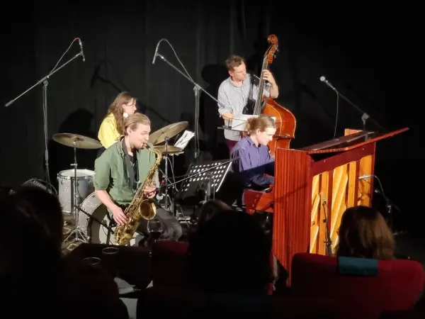 Bio Aspen arrangerar ”Lokaljazzen” där en jazzkvartett denna kväll spelar musik av Lars Gullin. Jag bjuder Håkan på konserten, han bjuder på burrata och vin i foajéns bistro innan. Han berättar om sin livslånga kärlek till jazzen som började i Bromma på Lars Gullins tid. Själv är jag jazznovis, men i salongens mörker rycks jag med av spelskickligheten, svänget och de många känslosamma solona.