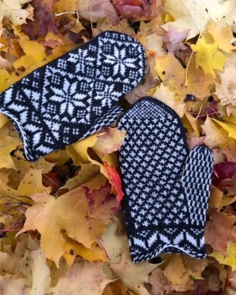 Promenad till jobbet. Det är inte helt ljust ute nu när jag går till jobbet. Idag var det också kallt, fuktigt och lite rått. Hade Tant Ainas vantar på mig. Det sägs att hon stickade en vante på en kväll. Hon sålde dem varje år på julmarknaden i församlingshemmet i byn där jag är uppväxt. 60 kronor paret, om jag minns rätt. Men det är länge sedan nu. Jag är väldigt glad att jag har flera par vantar som Aina stickat. När jag kom fram till jobbet gick jag in under den stora lönnen som pryder gårdens västra sida. Lade vantarna i de gula löven, laddade upp ett inlägg på instagram och i det berättar jag om Tant Aina och vantarna.